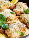 Chicken cutlet topped with cherry tomatoes buffalo mozzarella oregano and basil.